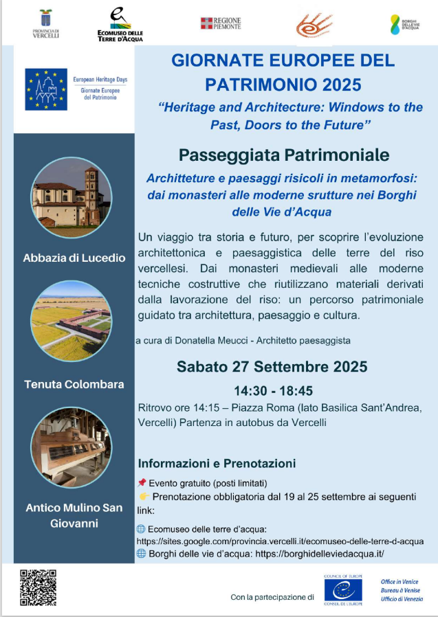 Sabato 27 settembre 2025, in occasione delle Giornate Europee del Patrimonio (GEP), l’Ecomuseo delle Terre d’Acqua organizza una speciale passeggiata patrimoniale tra le cellule dell’Ecomuseo delle Terre d’Acqua con partenza da Vercelli, gratuita e aperta a tutti, dedicata alla scoperta delle architetture e dei paesaggi risicoli del Vercellese.